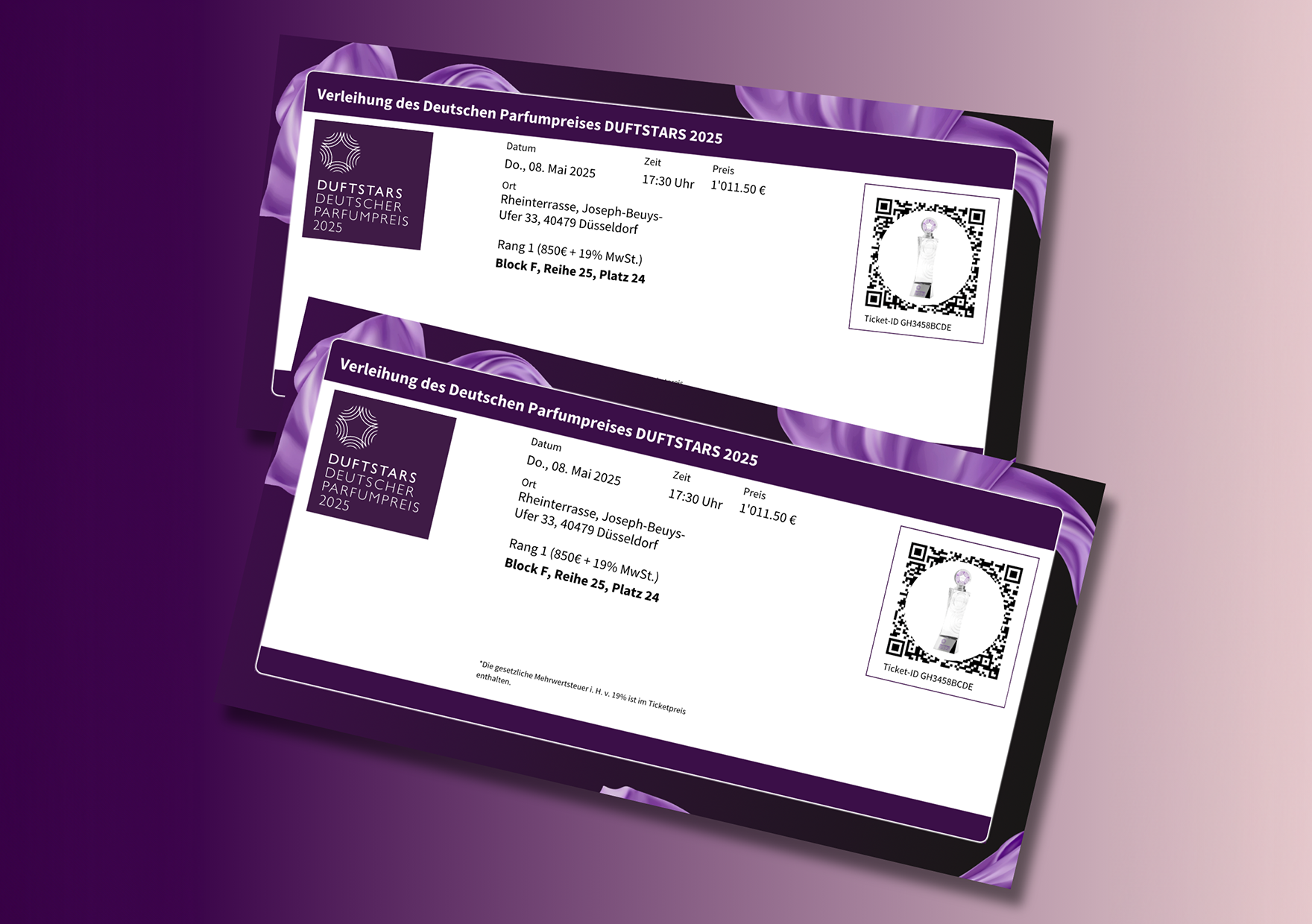 Unter allen Anmeldungen für den DUFTSTARS Live-Stream verlosen wir 2 Tickets und eine Hotelübernachtung für das Red Carpet Event in der Rheinterrasse in Düsseldorf.